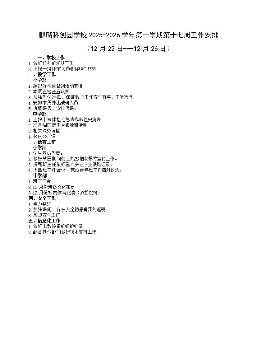 麒麟科创园学校2025-2026学年第一学期第十七周工作安排